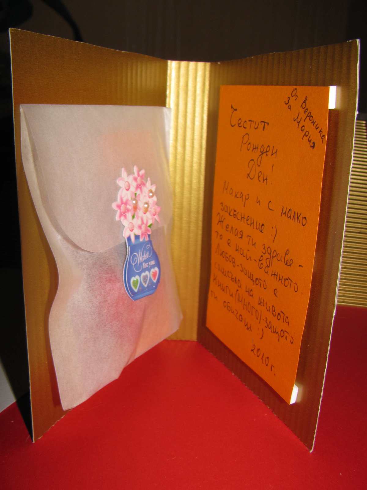 Картичката е във формата на книга, вътре има пожелание и джобче с подаръка, който е книгоразделител, сърцето и топчето накрая е направен чрез иглонабиване.